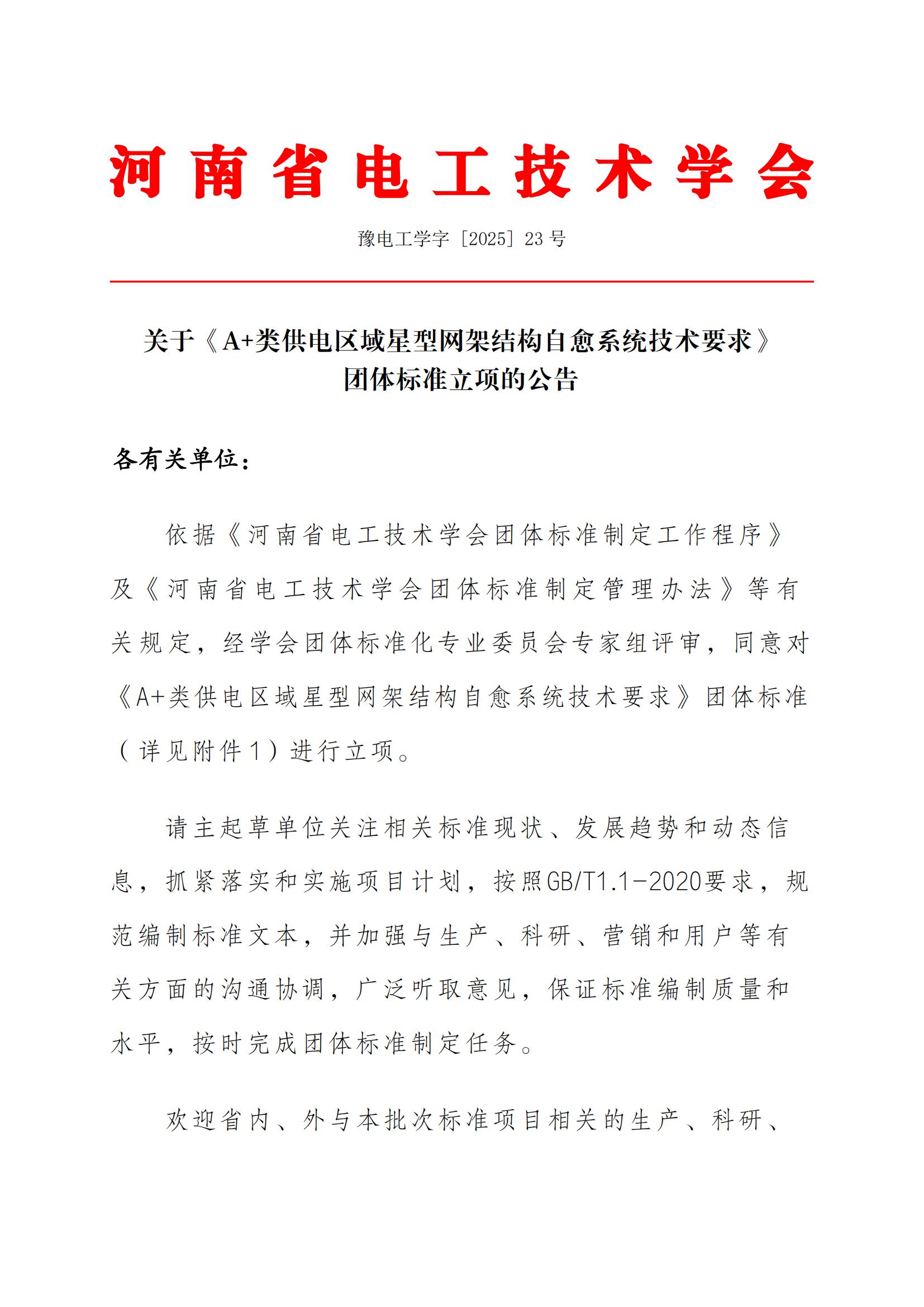 河南省电工技术学会关于《A+类供电区域星型网架结构自愈系统技术要求》团体标准立项公告.pdf